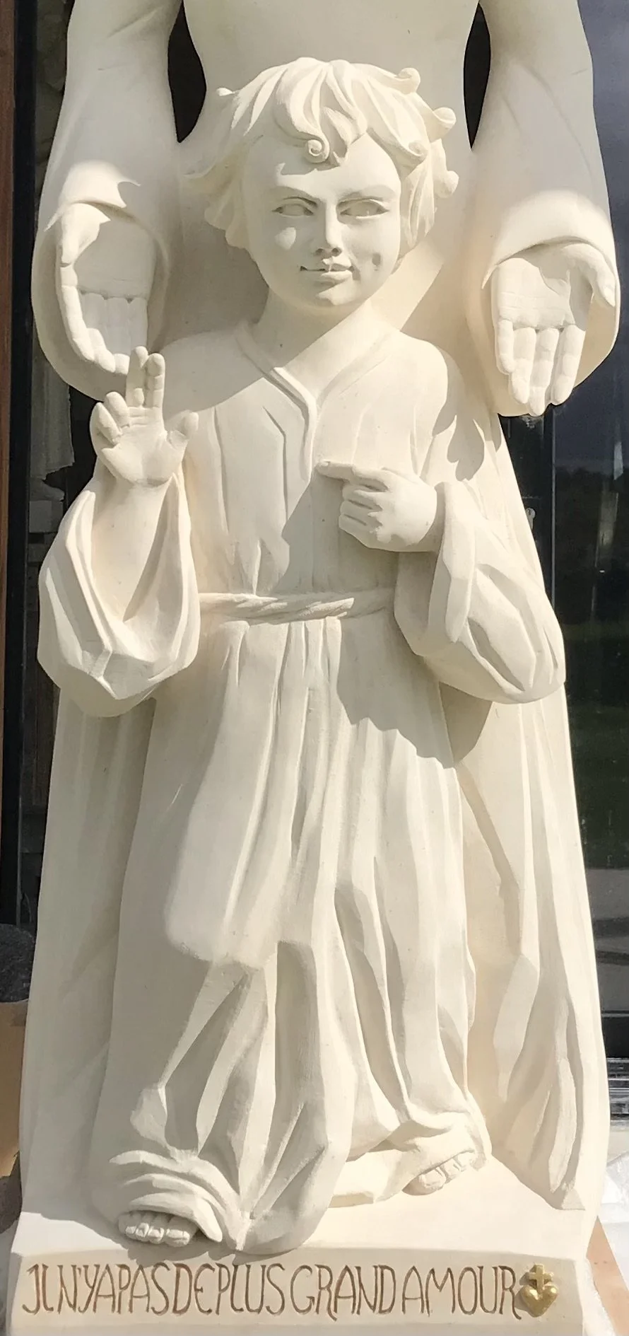 Statue en pierre représentant l'Enfant-Jésus  heureux avec la main droite en signe de paix et la main gauche pointant vers la poitrine, au-dessous l'inscription "IL N' Y A PAS DE PLUS GRAND AMOUR". Voir en taille réelle