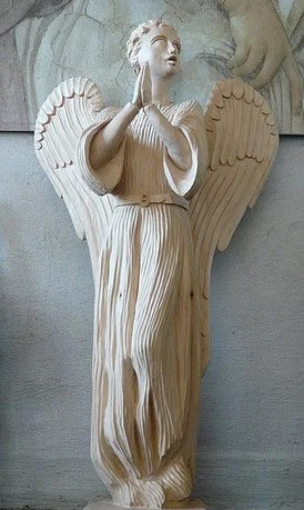Sculpture en bois d'un ange avec des ailes et les mains jointes en prière
