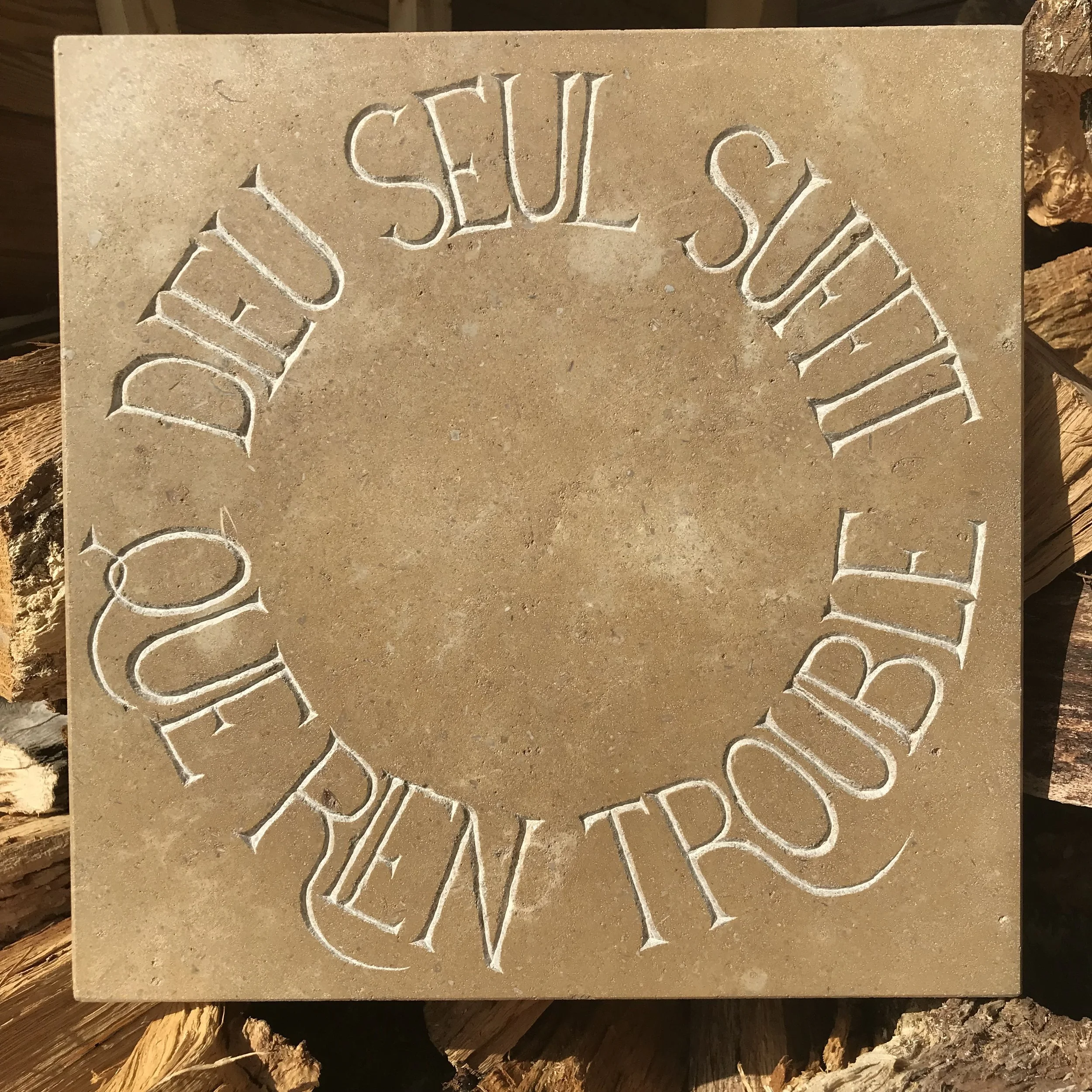 Une pierre gravée avec la phrase en français : "Dieu seul suffit, que rien trouble." Voir en taille réelle