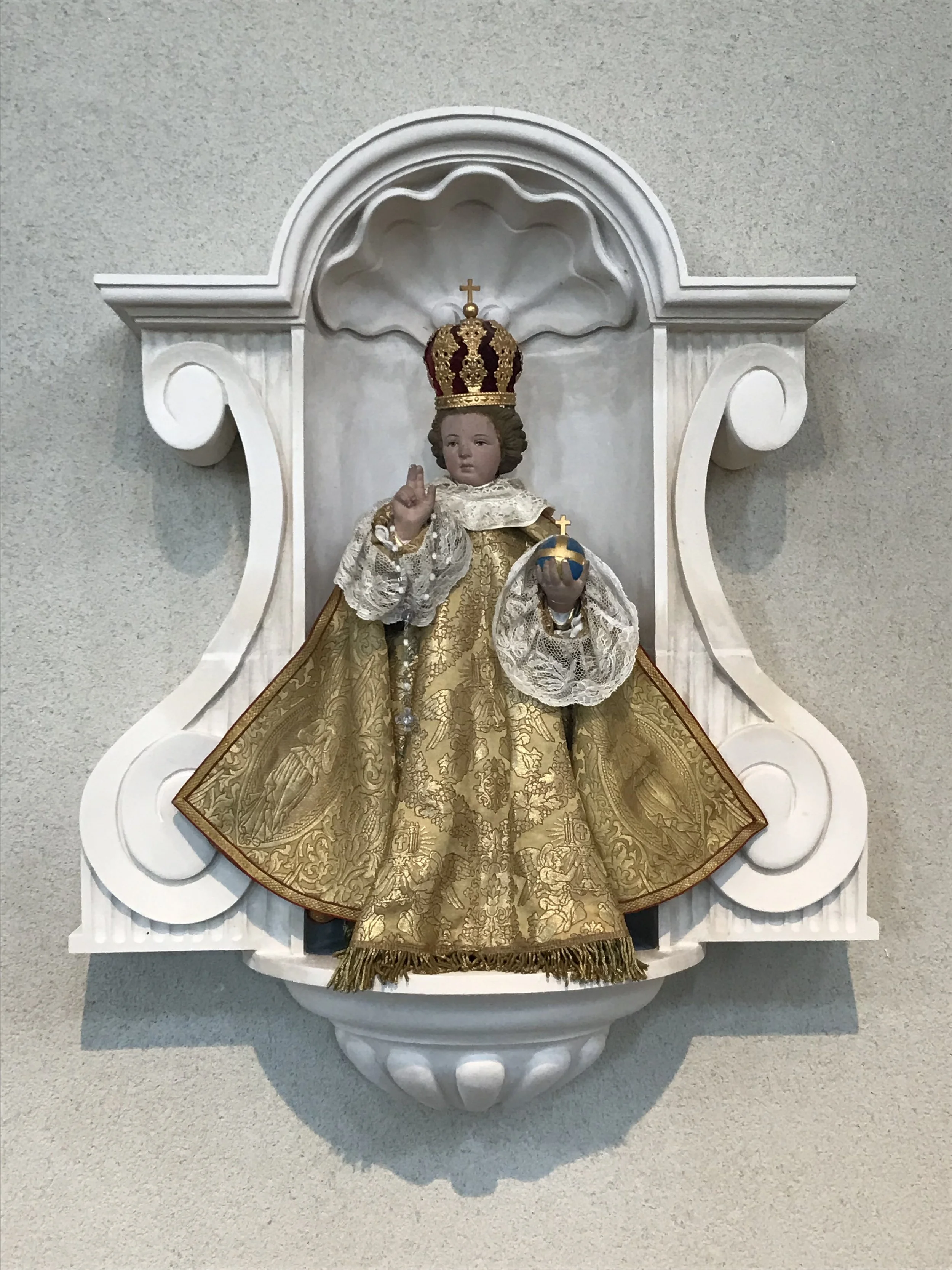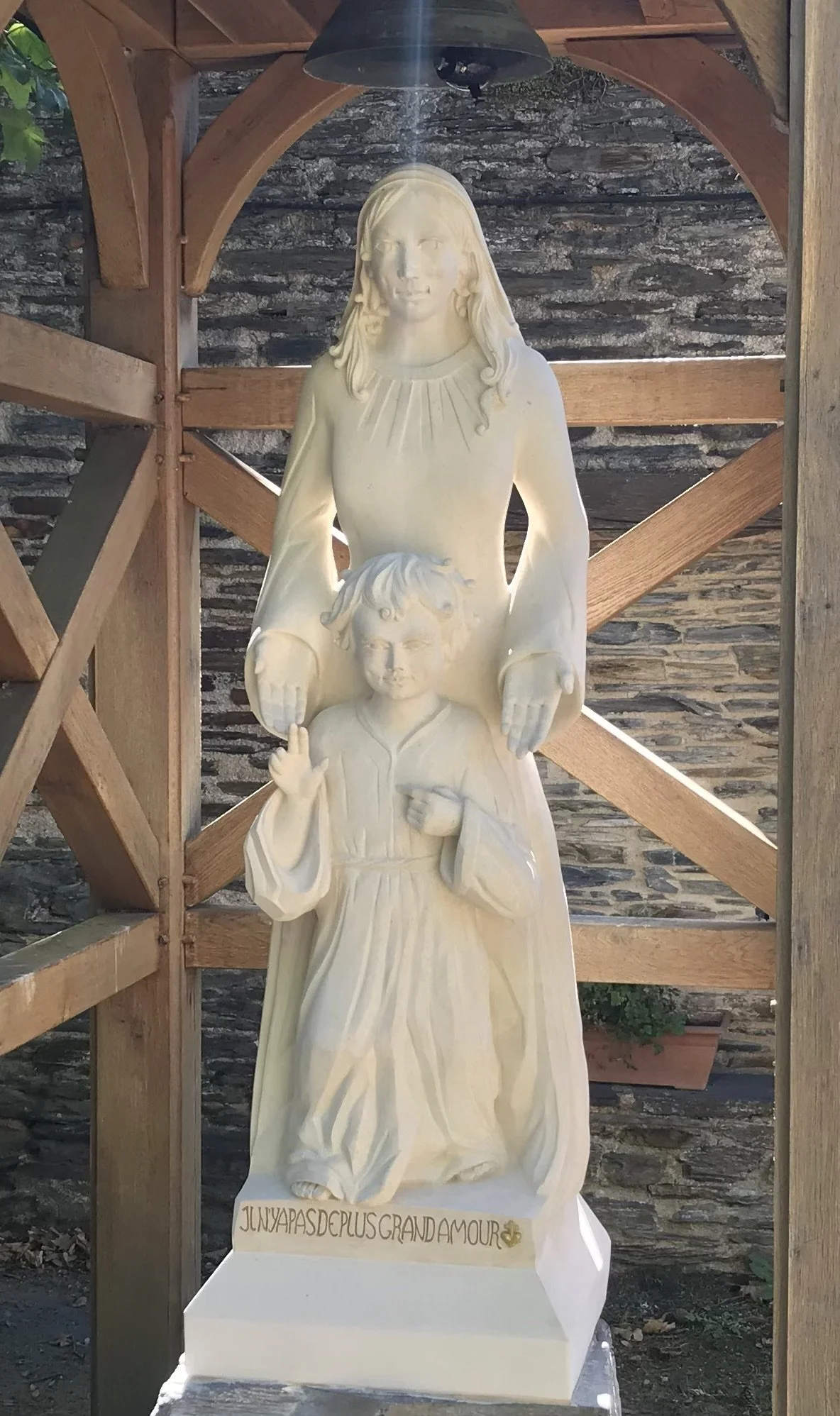 Statue en pierre représentant l'Enfant-Jésus  heureux avec la main droite en signe de paix et la main gauche pointant vers la poitrine, au-dessous l'inscription "IL N' Y A PAS DE PLUS GRAND AMOUR".
