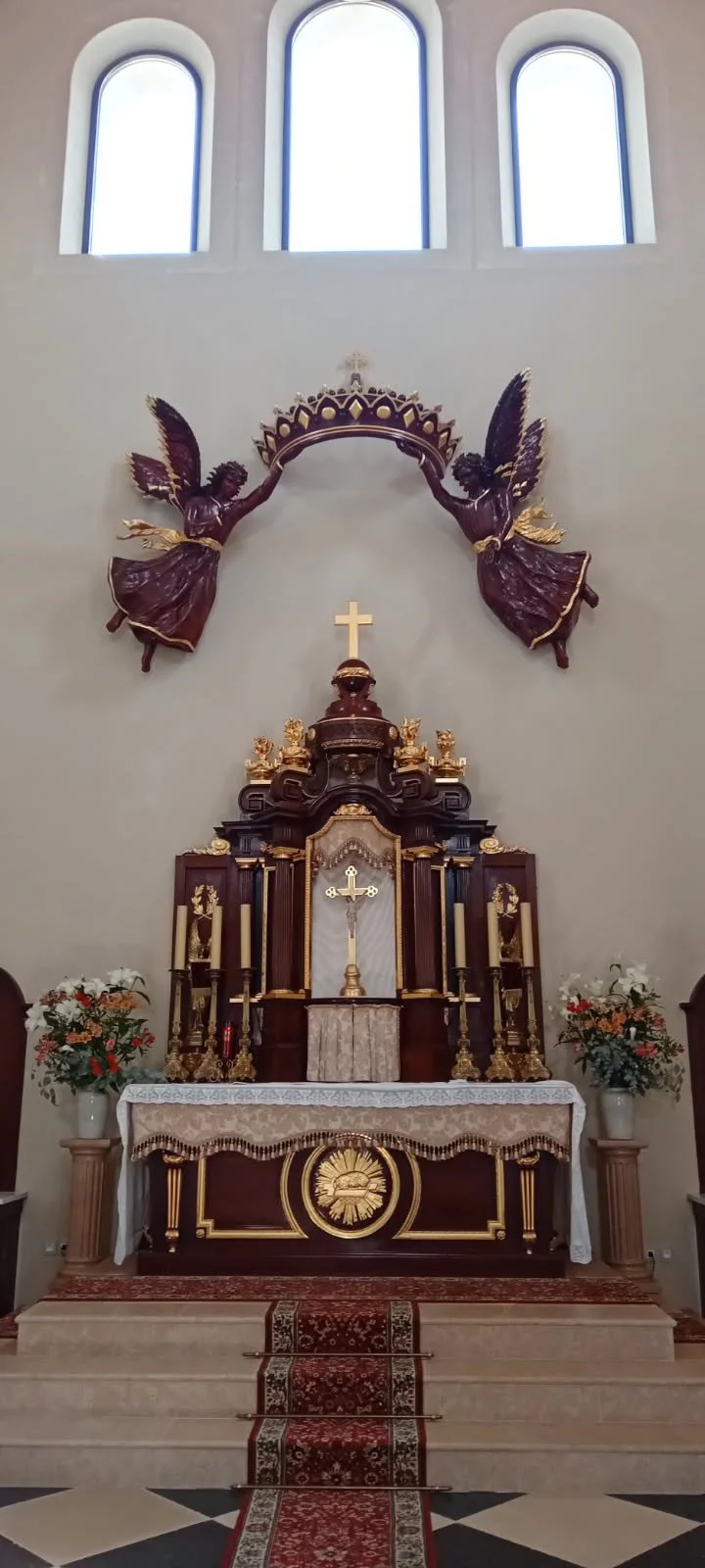 Autel de l'église avec croix, chaises, fleurs, sculptures en bois d'anges, et fenêtres en haut.