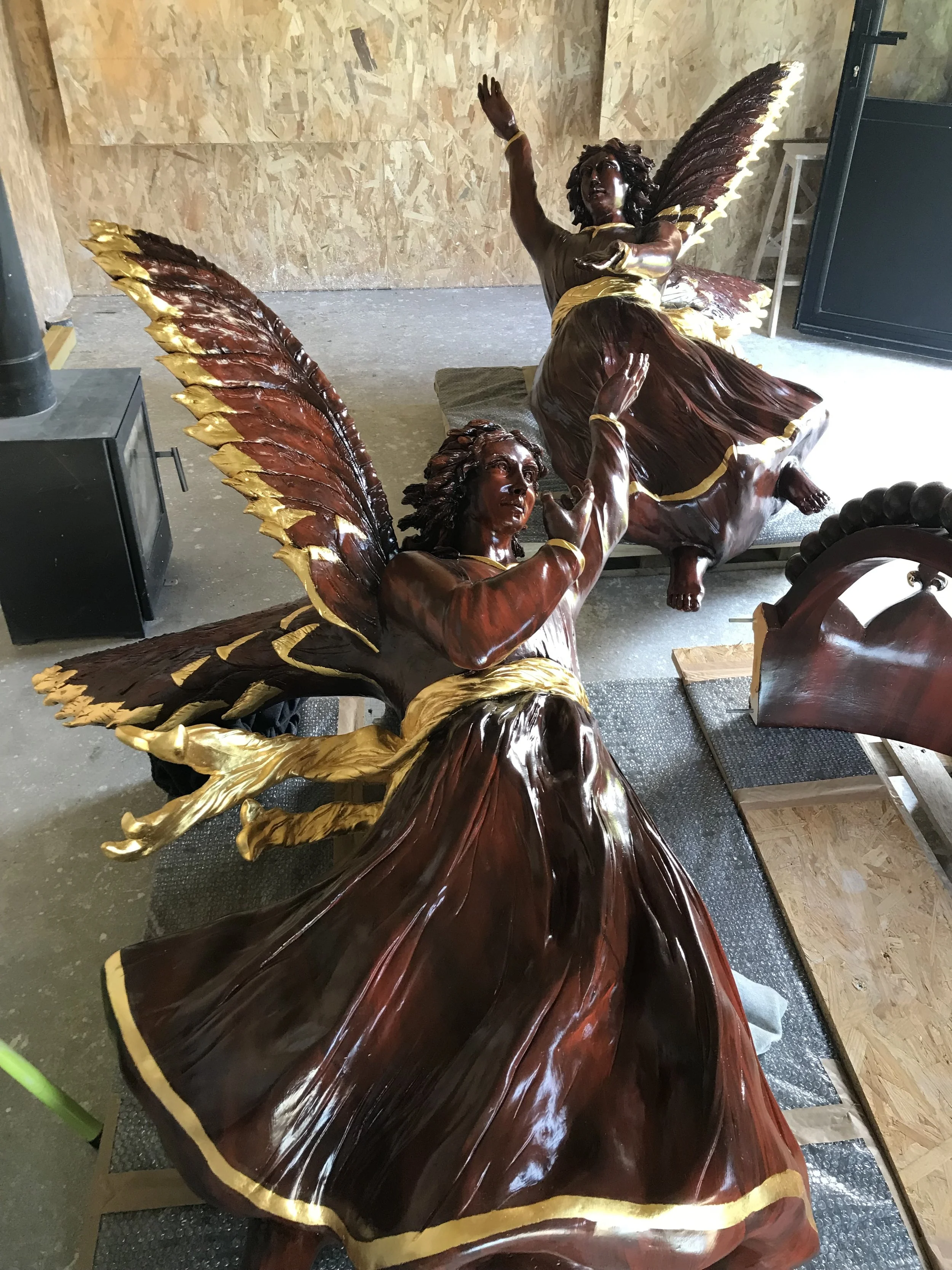 Trois sculptures en bois de figures angelicales avec ailes brunes et ailes dorées, en position de prière ou de célébration, dans un atelier.