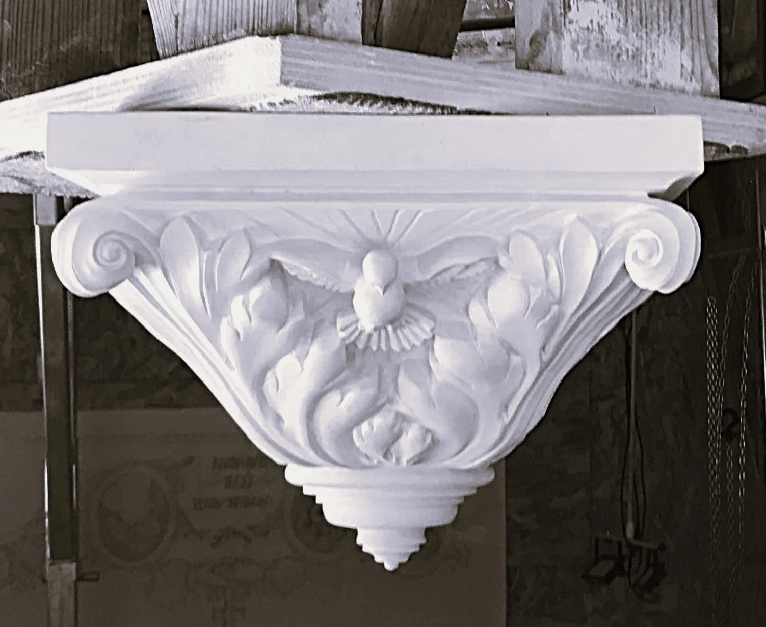 Sculpture en bois représentant deux anges portant une couronne. Les anges ont des ailes et des cheveux torsadés, dans un style religieux ornemental.